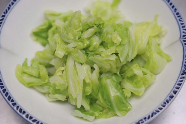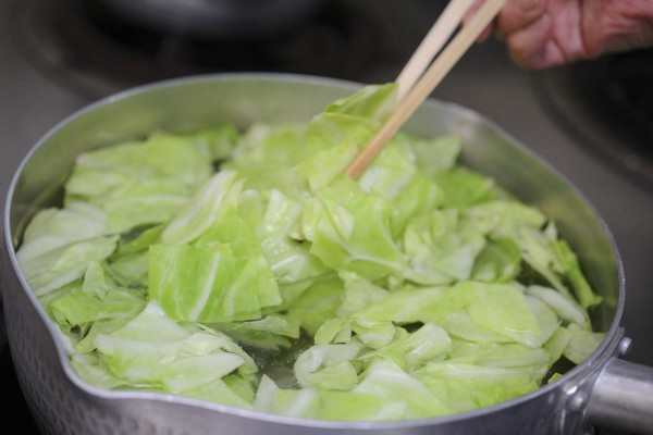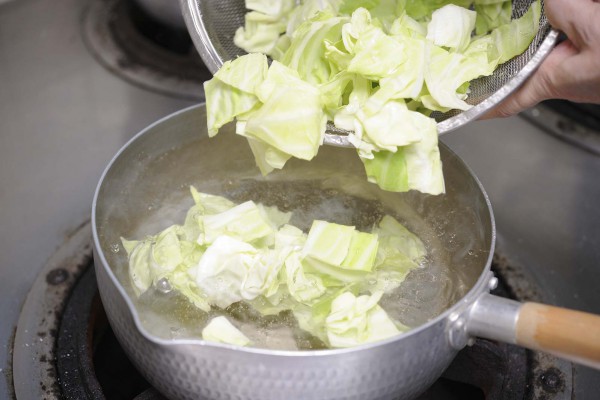 ① ざく切りにしたキャベツをサッとゆがいておきます。